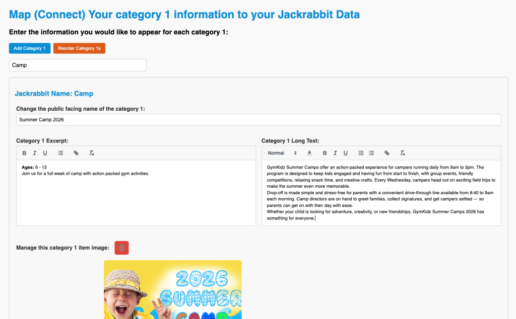 When using the Class Filter mapping you can help your users understand more about what that category means. Sometimes your Jackrabbit categories suggest ages, program types, experience levels, seasons, timing like long term or short term, and many other options.