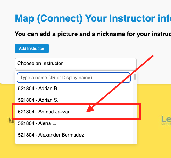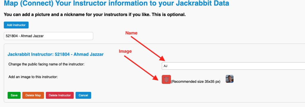In this example we will map “Ahmad Jazzar” will have his public facing (what your users will see) name be “AJ” and we will add a photo to this instructor. The photo will be a small thumbnail.