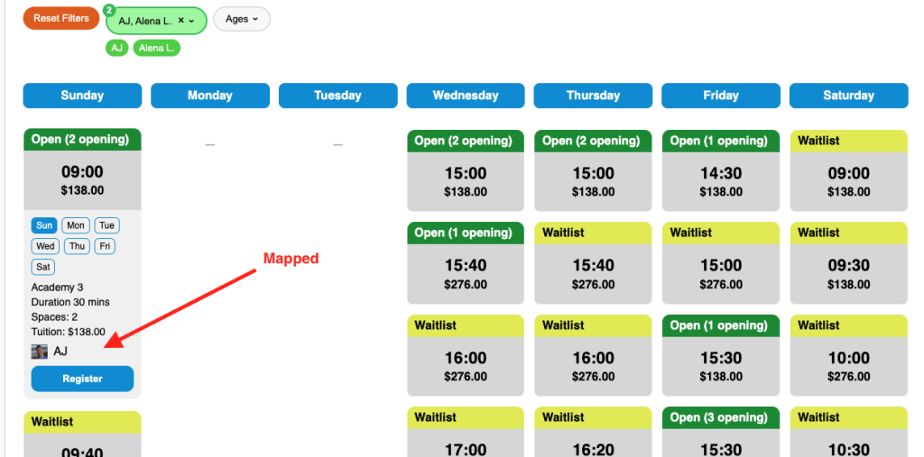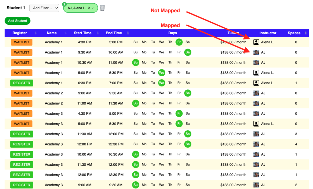 Here is an example of the mapped instructor in the class calendar