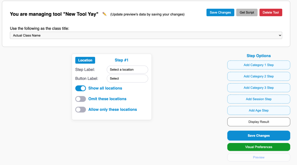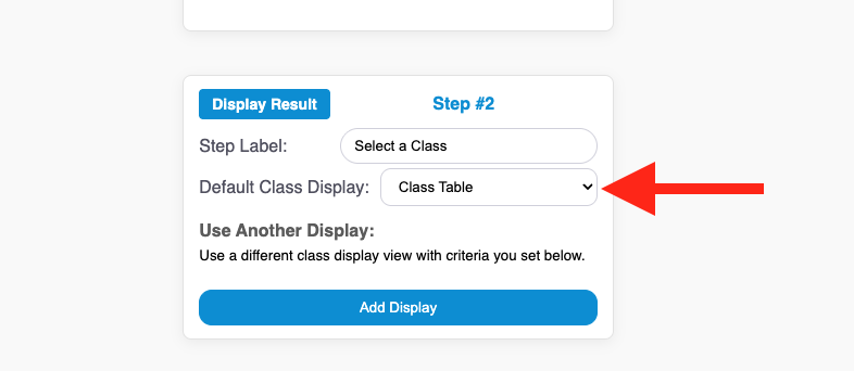 The final Step of any filter is the “Display Result” Step. To display a result the Class Filter needs to know how you would like it to display a result. You will add a default tool that it will utilize by selecting an option from the drop down. Youc an use a default tool or a highly custom tool. You will see all your tools that you have created in this list.