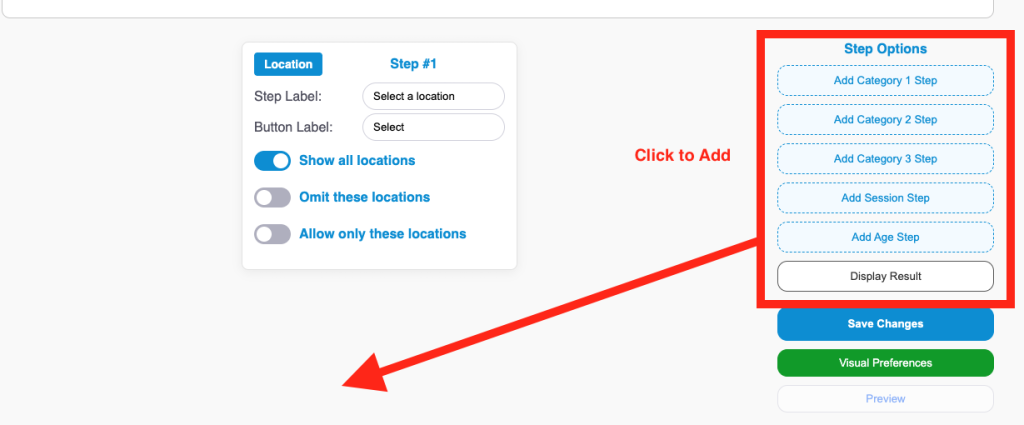 You can add Categories, Session, and Age steps to your filter. What makes sense for some schools may not make sense for other schools. To add a step you click the type of step in the right hand column.