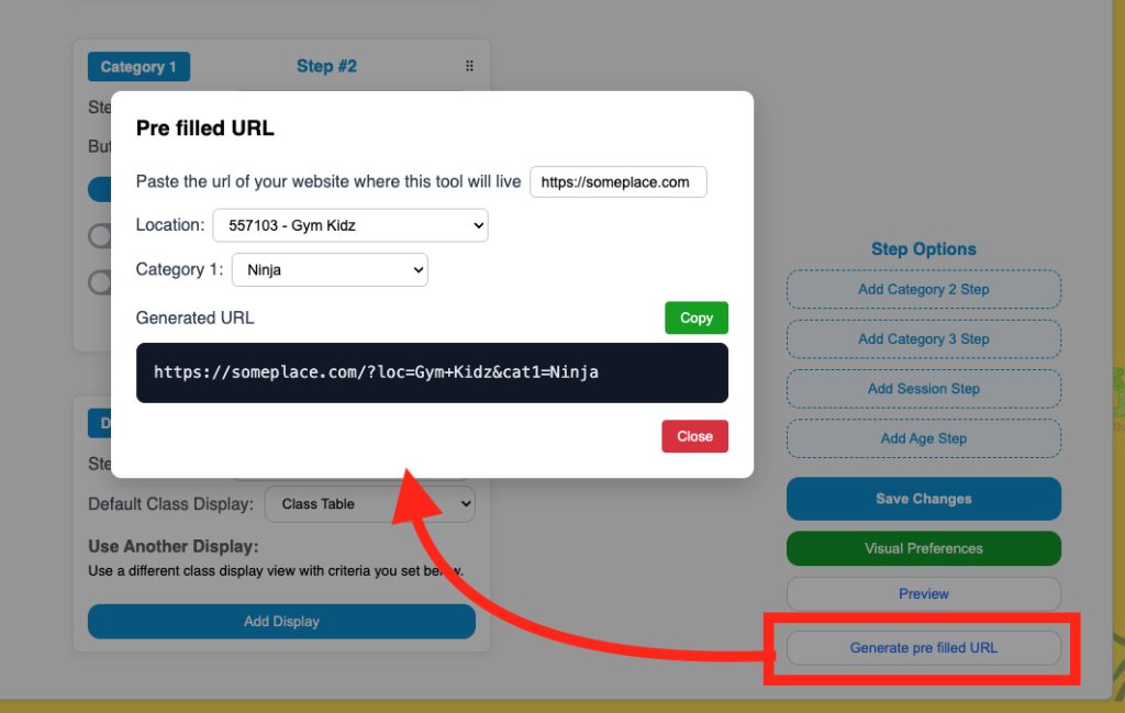 For example lets say you have a Ninja or Piano Class Page on your website that talks about your Ninja or Piano Classes. And on that page you have a button that says “Enroll in Piano Classes” or “View our Piano Schedule”. And you want to link to your filter but you don’t want to show the user your Saxaphone, Guitar, and Drum Classes after the clicked a link that said “Piano”. So you Generate a dynamic link by clicking “Generate pre Filled URL”.